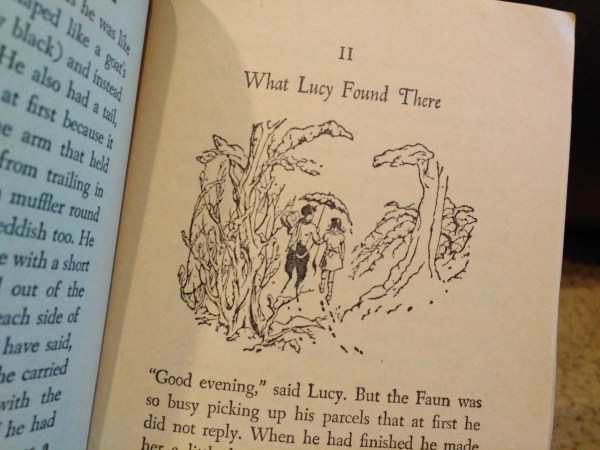 It has seen better years. The Lion, the Witch, and the Wardrobe, read considerably more times than the rest, consists at this point of as much tape as paper. And still entire folios fall out at my feet. Everything is gooed together–thanks to the wide assortment of inappropriate tape-types–and yellowing out of control, but not a single page has gone missing entirely.