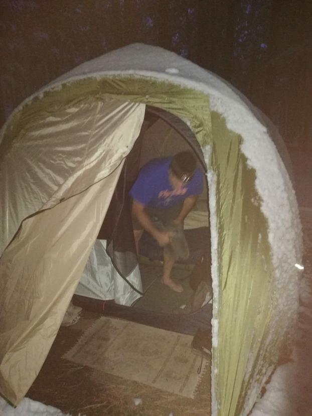 It indeed snowed all night. Tuesday morning, the new tent was in good shape, and had sloughed off most of the load as we slept. She’s a beast!