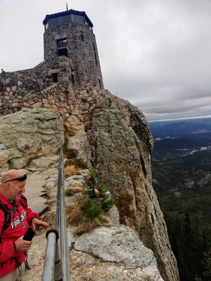 Last stop, Mt. Coolidge fire tower, with a great long view of Black Elk Peak, the Badlands, Cathedral Spires, Little Devil’s Tower, the side of Washington’s stony mug, and an in-your-face shot of Crazy Horse pointing right down your throat. That last one is a little startling through the binoculars; he’s a formidable guy.