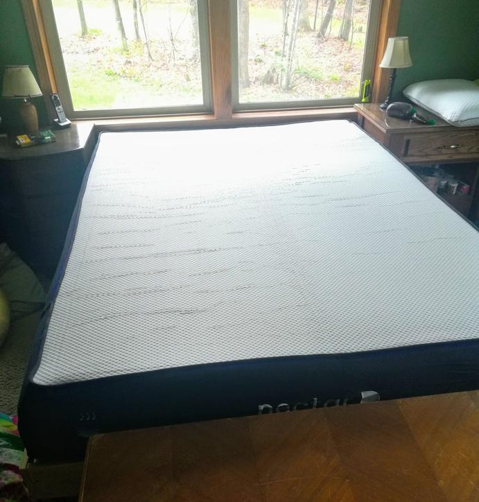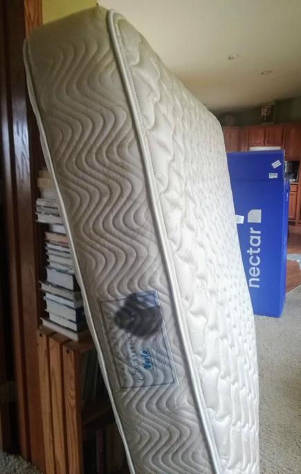 What did we learn? That the frame and box spring were indeed the bulk of the problem. That old Verlo is in pretty good shape, actually. It’s just not a good fit for this decrepit pelvis anymore. Sad. Take away the slightly-more-pliable-than-is-healthy box spring and the rickety frame, and NOW we’re truly sleeping on a board.