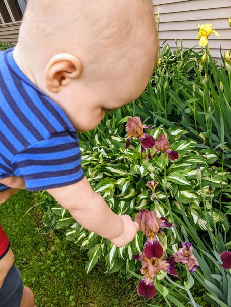 I love irises! My dad always had them in our yard when we were growing up. I have seen those withered up blooms but never gave it much thought. I had never looked closely enough to notice they were curled up into themselves. Adorable grand baby by the way! 😀