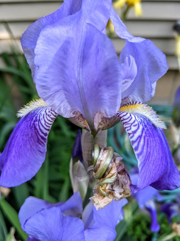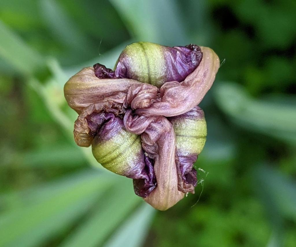 It seems that when my irises die off, they do not shed their blooms. They don’t drop their petals. They don’t let go of a’one of ’em. They very neatly curl them back in and twist them up and take them back into themselves.