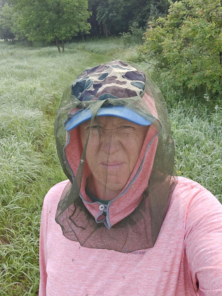 From then on that summer, and immediately upon the great hatching of 2025, I awoke early, so as to hike as cool as possible, donned my thinnest pants and my loosest sun-shirt, topped my noggin with a baseball cap and the hood of that sun-shirt, and then draped a very fashionable mosquito net down over the whole headdress. Bride of Blood Bug. Then I walked fast and swatted mercilessly. These were not the relaxing hikes of days gone by.